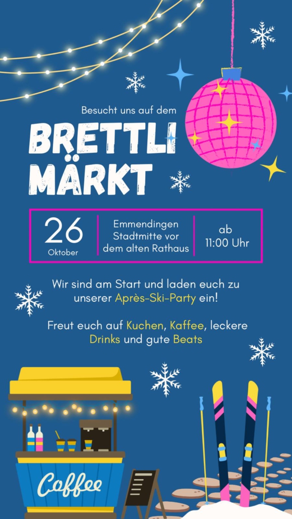 Am Sonntag, dem 26.10.2025 von 11:00 – 18:00 Uhr verwandelt sich die Emmendinger Innenstadt wieder einmal in das größte Freiluftkaufhaus der Region. Viele Händler präsentieren die neuesten Wintersportartikel und wir stehen Euch mit Rat und Tat gerne zur Seite. Ebenso informieren wir über unser Winterangebot wie Skigymnastik, Ski- & Snowboardkurse, Schneeschuhwanderungen bis hin zu unserem Ganzjahres-Programm wie NordicWalking, Rennradeln und vielem mehr.